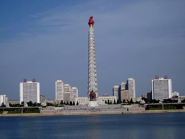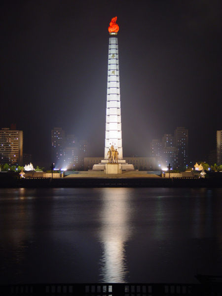 主體思想塔(????? Juche Tower) 位于朝鮮民主主義人民共和國(guó)首都平壤市市中心的大同江畔,是為祝賀金日成七十壽辰而建的,塔及其周圍附屬建筑占地總面積15萬(wàn)平方米。1982年4月15日竣工揭幕。主體思想塔是金日成主席創(chuàng)立的“主體思想”的象征。塔的正面,建有高30米、重33噸的象征工人、農(nóng)民、知識(shí)分子的三人群像,左右是以“主體工業(yè)”、“豐年”、“學(xué)習(xí)之國(guó)”、“無(wú)病長(zhǎng)壽”、“主體藝術(shù)”、“銅墻鐵壁”為主題的花崗巖群像。