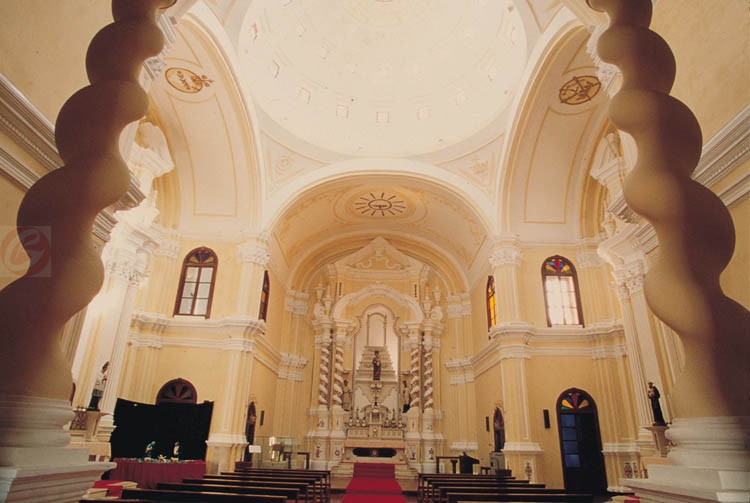 修院圣堂屬巴洛克風(fēng)格。正面有三個入口,主堂平面成拉丁十字型,長軸長27米,短軸長16米,長軸兩端分別為入口前廳及主祭壇。版權(quán)所有山東聊城聊之旅國際旅行社有限公司,轉(zhuǎn)載必究!祭壇供放其主保(圣若瑟)像,裝飾甚多,其中兩組四枝腰纏金葉的旋柱最具特色,柱頭則以破山花形式收結(jié)。而與之呼應(yīng)的是入口前廳中四枝支撐二樓唱詩臺,來自原圣方濟(jì)各修道院的木制盤旋柱。四個拱頂形成一四邊內(nèi)彎之正方形空間,其上以一羅馬式穹窿封頂,穹窿直徑為12.5米,頂部高度為19米,開有三環(huán)各16個窗戶,其中最高一環(huán)為假窗,另兩環(huán)才具有透風(fēng)及采光功能,穹頂內(nèi)側(cè)為白色,中間是黃色的耶穌會會的徽。