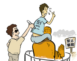 第二例,陜西李文春攀爬紅軍雕塑照相案。照片被微信傳出后,引起公眾的譴責(zé)。國(guó)家旅游局立即進(jìn)行督辦,陜西省旅游局已將李文春已并列入“游客不文明行為記錄”。吳起縣勝利山景區(qū)因管理不嚴(yán),被取消年度評(píng)先評(píng)優(yōu)資格。國(guó)家旅游局研究決定:⑴將李文春列入“全國(guó)游客不文明行為記錄”,期限10年;⑵吳起縣勝利山景區(qū)因管理不善,兩年內(nèi)不得參評(píng)A級(jí)景區(qū)。