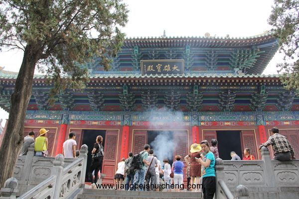 穿過天王殿,其后有大雄寶殿。殿內(nèi)供奉著釋迦牟尼、阿彌陀佛、藥師佛的神像,屏墻后面懸塑觀音像,兩側(cè)有十八羅漢侍立。大雄寶殿之后,又有藏經(jīng)閣藏書八百萬卷,這是寺僧藏經(jīng)說法的場所。