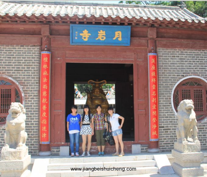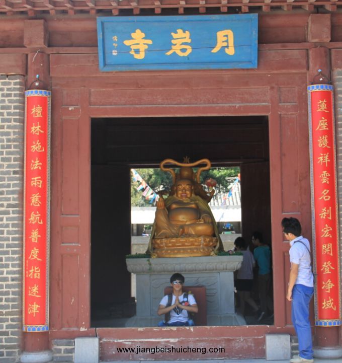 山坡上有一條新修建的臺階路,直通山頂。據(jù)當?shù)乩相l(xiāng)說,上面有一尊大佛,還有古長城圍墻。于是,雖然天氣炎熱,我們還是想一探究竟。臺階較陡,拾級而上不多時就汗流浹背氣喘吁吁。在半山腰山道左邊,一尊面目慈祥的石雕坐佛依山望湖。再往上,很快就登頂了,發(fā)現(xiàn)所謂的古長城圍墻不過是用碎石堆砌而成。下山之后,我們繼續(xù)驅車繞山而行,至山的背面,有一月巖寺。月巖寺坐落在昆山的西側,一說創(chuàng)建于漢代,一說始建于唐代。其藏居深山,古樹掩映,晨鐘暮鼓方知山中有寺。