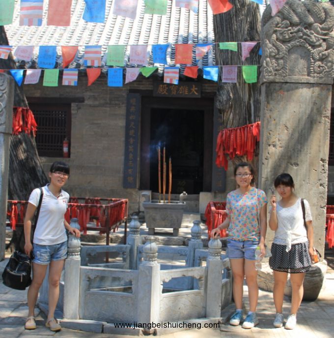 寺院有大雄寶殿、藏經(jīng)閣以及左右配殿和后殿,為前后雙重院建筑。殿內(nèi)雕梁畫棟,繪滿壁畫,甚為美觀。殿前唐柏兩棵,一為“雀柏”,一為“血柏”,樹干粗大,參天蔽日,掩映佛殿。院內(nèi)左前方有明代萬歷七年重修的全石質結構鐘樓,四角攢頂,石柱上題記多處,造型精美,是不可多得的明代鐘樓建筑。寺院東即為“馬跑泉”、石室洞奇觀,洞口上有清康熙年間地方名人馬光遠書寫的泉名。通過玻璃,發(fā)現(xiàn)洞內(nèi)泉水依稀看見,據(jù)說終年不斷,流出洞外順著人工開鑿的石槽流入寺內(nèi)荷花池內(nèi)。寺內(nèi)一操四川口音的年長和尚,熱情地給人們作著講解。