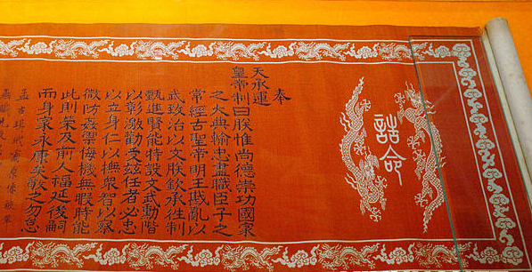 博物館館長(zhǎng)劉新華先生介紹,這處“圣旨”博物館為二層仿古建筑,展出面積1000多平方米,館藏明代、清代的詔書、國書、誥封、敕封(通稱為圣旨) 達(dá)132道之多,開館展出的“圣旨”55道,以及“偽滿洲國圣旨”和日本、越南、韓國等國家的“圣旨”,并配以明清時(shí)期的科舉試題、殿試卷、官場(chǎng)文書、字畫匾牌及用墨魚汁做墨汁密寫在衣衫內(nèi)的“夾帶小抄”等科舉文物2000多件,反映了當(dāng)時(shí)的政治、經(jīng)濟(jì)、軍事、外交及中國宮廷文化等多種形態(tài)。