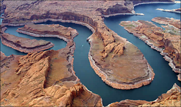 鮑威爾(POWELL)湖是為紀(jì)念那位第一個漂流此河并建議開發(fā)水利的先驅(qū)而命名的。它的面積是米德湖的兩倍多,有各種紅色砂巖、石拱、峽谷和萬面碧波,其風(fēng)景遠(yuǎn)勝米德湖,已成為美國西南部的主要國家度假區(qū)。