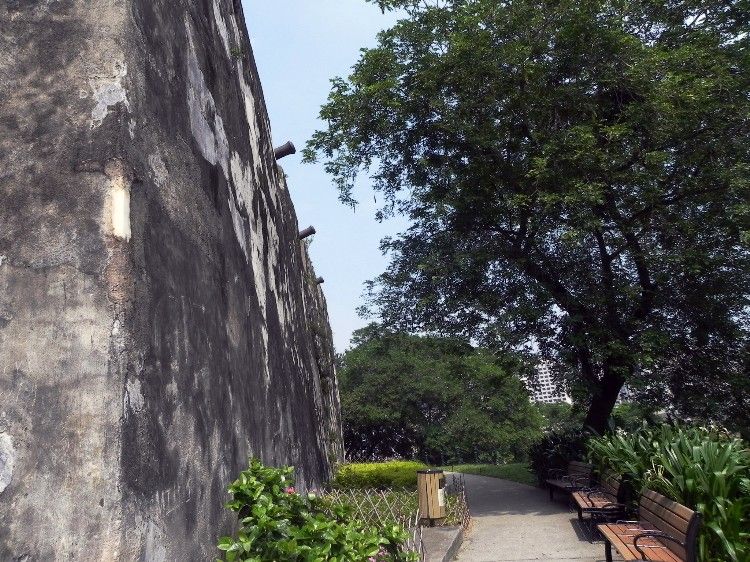 炮臺占地約一萬平方米,呈不規(guī)則四邊形,版權所有山東聊城聊之旅國際旅行社有限公司,轉(zhuǎn)載必究!邊長均約為100米,四個墻角外突成為棱堡,炮臺東北、西南及東南面墻身建基于3.7 米寬的花崗石基礎上,墻身以夯土砌建,并以蠔殼粉末作灰泥批蕩,堅實非常,墻高約9 米,往上收窄成2.7 米寬。女兒墻高約2 米,成雉堞狀,可架設多達32門大炮,以防范來自此兩方向之攻擊。東南墻兩角更設有碉堡。面向中國大陸的西北墻身,主要以花崗石砌筑,女兒墻較矮且沒有炮口設置,這主要顯示其對海外的防御作用以及對當時中國官方的友好姿態(tài)。