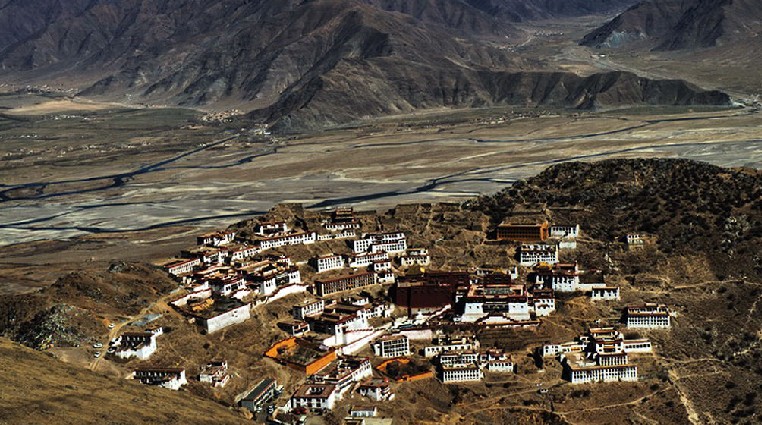 甘丹寺位于拉薩達孜縣境內(nèi)拉薩河南岸海拔3800米的旺波日山上,距拉薩57公里。旺波日山猶如一頭臥伏的巨象,馱載著布滿山坳、規(guī)模龐大的建筑群,充分體現(xiàn)出傳統(tǒng)藏傳佛教寺院建筑因地制宜,寺廟傍山而立,群樓重疊,巍峨壯觀。整座建筑群由佛殿、喇章宮殿、僧院札倉和米村及其附屬建筑單元組成。