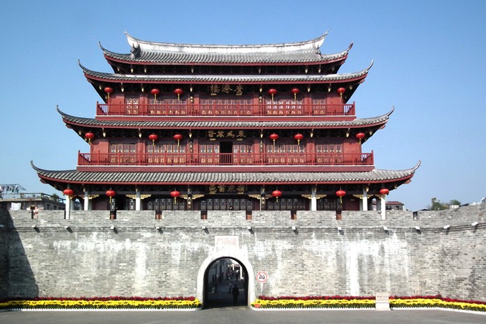 廣濟門城樓是一座宮殿式三層歇山頂閣樓,外城門原有“東為萬春”門額。樓置于高大厚實的臺基上,拱門中開,面闊七間,進深五間,前后面為木石柱相銜接支撐,并跨出城墻外,成為騎樓。城樓為仿宮殿式建筑,重檐歇山頂,配以玻璃瓦紅彤壁,朱柱格子窗,畫棟雕梁,顯得雄偉壯觀。城樓中開拱門,高3.62米,寬2.9米。三樓懸巨型銅鐘1座,鑄于南宋紹興四年(1134)。原置于馬王廟,廟廢,遂移此。廣濟門大江前橫,長橋當戶,扼守閩贛交通要沖。沿廣濟門城樓南北兩側,至今還有2000多米長的古城墻和竹木門、上水門、下水門3座古城樓。暮春三月,登樓眺望,韓江水漲,煙波浩渺,筆峰如畫,行船如梭,別有一番景致,故潮州內八景有“東樓觀潮”之勝。