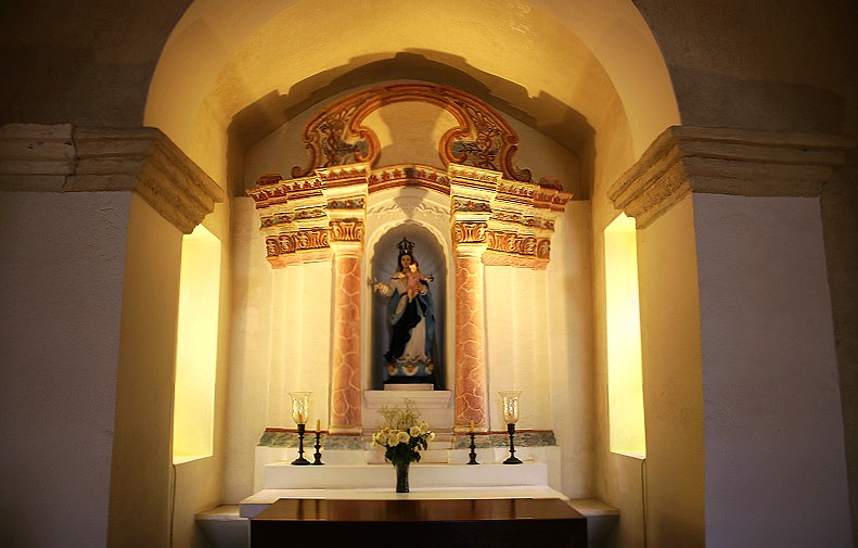 圣母雪地殿教堂的天花呈拱形,墻身繪有圣經(jīng)故事和人物的彩色壁畫(huà)。祭衣房的壁畫(huà)線條秀麗活潑,揉合了中國(guó)的繪畫(huà)技法和西方色彩,中西方的文化與藝術(shù)和諧地融匯一起。壁畫(huà)繪有:瑪利亞、圣安東尼、獅子、雙頭鷹與牡丹等圖案,極具藝術(shù)價(jià)值與觀賞性。