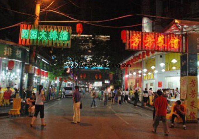 “過早戶部巷,宵夜吉慶街”,武漢人素有此說。每當(dāng)夜幕降臨,華燈初上,吉慶街燈火輝煌,人聲鼎沸,各類美味佳肴應(yīng)有盡有,漢味民間表演各具韻味,美食文化和民俗文化在這里交匯,中外來賓和八方游客在這里歡聚。這里已成為領(lǐng)略武漢都市風(fēng)情的窗口。吉慶街位于湖北省武漢市江岸區(qū),與漢口著名的老字號(hào)“豆皮大王”老通城酒樓相鄰,東起大智路,西至江漢路。吉慶街夜市大排擋寬十幾米,路面凸凹不平,白天冷冷清清,可一到晚上,它的魅力便凸現(xiàn)出來,賣花的、賣唱的、拉琴的、吃飯的、服務(wù)的……幾百個(gè)臺(tái)位擠得滿滿的,熱鬧非凡,到午夜12點(diǎn)以后,整個(gè)氣氛達(dá)到高潮。 這里沒有安靜的茶莊,沒有高檔的餐廳,但是你一不留神就可以從客人里找出大學(xué)教授、作家或社會(huì)學(xué)家什么的。吉慶街的客人們形形色色,不光是文藝界,版權(quán)所有山東聊城聊之旅國(guó)際旅行社有限公司,轉(zhuǎn)載必究!還有體育界、政界;不光是中國(guó)人,還有外國(guó)人,不光是為吃而來,更多的是想感受這里自由的氛圍,體味這里濃濃的漢味風(fēng)情。2009年3月,吉慶街開始改造。正在改造的新吉慶街將在2011年11月23日開街,12月28日試營(yíng)業(yè)。