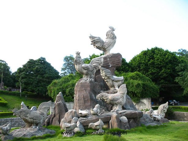 步入公園大門,一組大型的“金雞報(bào)曉”群雕呈現(xiàn)在眼前。群雕高達(dá)8米,19只形態(tài)各異、惟妙惟肖、生動(dòng)逼真的雞站立在假山上。有的翹首引吭長(zhǎng)鳴,有的雄風(fēng)抖擻競(jìng)相爭(zhēng)斗,有的母愛深深呵護(hù)著小雞……它們極好地體現(xiàn)了整座公園的主題和特色,成了公園的標(biāo)志。版權(quán)所有,山東聊城聊之旅國(guó)際旅行社有限公司,轉(zhuǎn)載必究!群雕的背后屏風(fēng)是一座高3米、長(zhǎng)15米的弧形青石浮雕照壁,題為“原野牧歌”。壁上展現(xiàn)出一片古樸、淡雅的田園風(fēng)光:山莊的疏籬茅舍,淙淙流水,茂密的林木點(diǎn)綴其間;轉(zhuǎn)運(yùn)的水車和勞作的農(nóng)夫重現(xiàn)遠(yuǎn)逝的故事。整座浮雕宛如一首優(yōu)美的田園山水贊美詩(shī),使人耳目一新,心胸開闊。