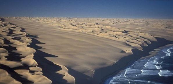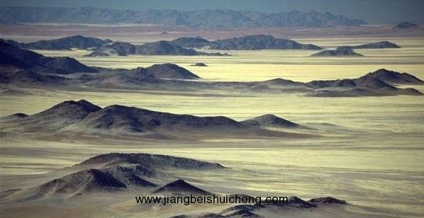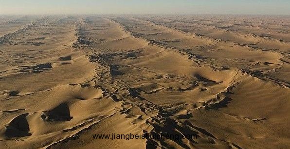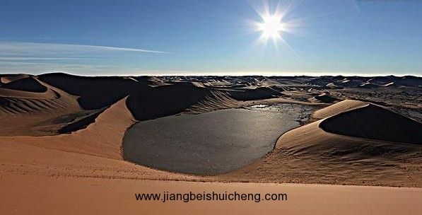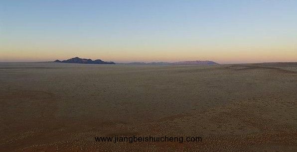 在Sossusvlei附近有另一個令人贊嘆的地景,Dead Vlei(意為死去的沼澤),這個盆地因為千年前河流改道而形成,盆地里,失去地下水漪注的刺槐于是成批死亡,極干之地的分解緩慢,于是這些枯木許多世紀以來便一直矗立在這里,形成有如異世界般的風(fēng)景。
