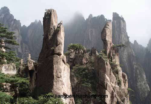 仙人踩高蹺在排云亭前,遠(yuǎn)瞰正前方,可見有一石,下端極細(xì),似一根根子插在地上,上端若一人直立,身子向前微傾,其狀酷似民間游樂節(jié)目“踩高蹺”。每當(dāng)云霧繚繞時(shí),則象仙人踩著高蹺,在西海峰壑中攬勝,故名“仙人踩高蹺”。