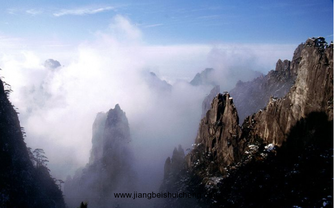 仙女繡花在安徽省黃山的白云景區(qū),位于排云亭前,向左眺望,遠(yuǎn)處石床峰上有一巧石似少女,面前有一奇松,如繡花臺(tái)繃,美其名“仙女繡花”。
