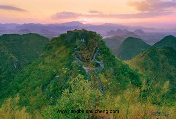 去龍州城十里,過(guò)龍北農(nóng)場(chǎng),那高聳入云的將山,就象一道綠色的屏障橫亙?cè)诿媲?。沿著座座峰巒,一道深灰色的古建筑物就象“灰色長(zhǎng)龍”,蜿蜒伸展,這便是屹立南疆邊睡的古炮臺(tái)群。因它綿延數(shù)十里,相連一體,故名曰“小連(壘)城”。