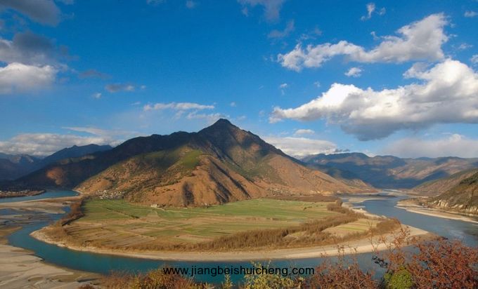 金沙江第一灣位于川滇藏三省區(qū)結(jié)合部的得榮縣子庚鄉(xiāng)境內(nèi)。由北向南縱貫全境的定曲河,在先后接納了瑪伊河和碩曲河之后,攜三江之水投入了金沙江的懷抱,在江水匯合處,形成“三壁夾兩江”的奇景。穿山越谷而來的金沙江,由此水勢更加浩蕩,峽谷逐漸開闊,在即將沖出這川滇要塞之時,它似乎想先舒緩一下長途奔波的疲勞,于是放慢腳步,圍繞著金字塔般的日錐峰瀟灑地畫了一個“Ω”字形的大拐彎。孰料這不經(jīng)意的即興之作,竟成就了一處奇觀。
