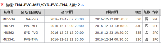 (請(qǐng)客人于2016年12月12日上午05:00在濟(jì)南機(jī)場內(nèi)自行乘坐國內(nèi)段航班前往上海浦東機(jī)場,請(qǐng)客人務(wù)必?cái)y帶護(hù)照復(fù)印件、身份證原件和機(jī)票行程單自行辦理飛往上海的航班的登機(jī)手續(xù)。 因個(gè)人原因?qū)е逻t到不能辦理登機(jī)牌,責(zé)任自負(fù)。 去程聯(lián)運(yùn)請(qǐng)務(wù)必乘坐,否則全程機(jī)票取消,后果請(qǐng)客人自負(fù)。 |