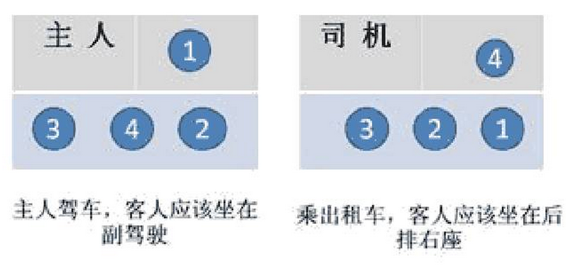 小轎車1號(hào)座位在司機(jī)的右后邊,2號(hào)座位在司機(jī)的正后邊,3號(hào)座位在司機(jī)的旁邊。(如果后排乘坐三人,則3號(hào)座位在后排的中間)。