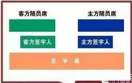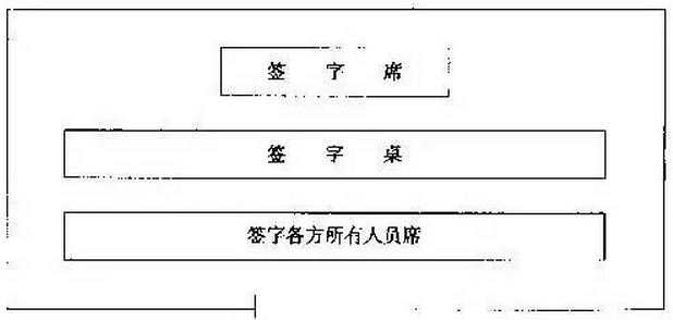 一般簽字桌橫放。簽字者面門而坐,賓右主左。參加者列隊(duì)站在簽字者之后。中央高于兩側(cè),右側(cè)高于左側(cè)。