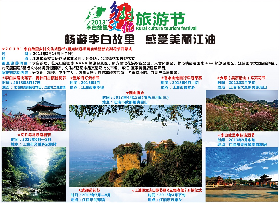 本次鄉(xiāng)村旅游節(jié)從3月16日開(kāi)始,到12月結(jié)束。除3月舉行的新安梨花節(jié)、青蓮桃花節(jié)外,還將陸續(xù)開(kāi)展香水鄉(xiāng)山自行車冠軍賽、竇圌山廟會(huì)、吳家后山辛夷花節(jié)、江油原生態(tài)山歌節(jié)、武都荷花節(jié)、養(yǎng)馬峽避暑節(jié)、李白故里中秋詩(shī)酒節(jié)等活動(dòng)。期間,還將開(kāi)展攝影大賽、評(píng)選江油十景、名小吃名特產(chǎn)品展銷、水果采摘等30多項(xiàng)活動(dòng)。