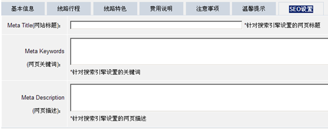 (2)(網(wǎng)頁關(guān)鍵詞):針對搜索引擎設(shè)置的關(guān)鍵詞 填寫線路內(nèi)包含的景區(qū)景點(diǎn)名稱,以及涉及到的地名?。ㄈ纾褐?、國家、省份、市、區(qū)、縣等地名)