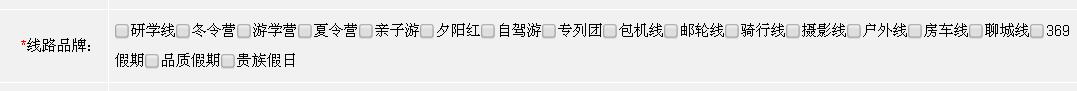 (3)線路品牌:可多選。 (線路品牌有嚴(yán)格的限制,比如攝影和戶外線,這個(gè)是需要專業(yè)領(lǐng)隊(duì)帶隊(duì)的,再,包機(jī)線路,必須是包機(jī)線路才可以,不是所有的飛機(jī)團(tuán)都是包機(jī);線路必須定位準(zhǔn)確,客戶才能最短時(shí)間找到哦。這個(gè)選項(xiàng)不是必選的,常規(guī)的行程可以選擇后面三個(gè) 369假期,品質(zhì)假期,貴族假日 其中一個(gè) 分別代表公司產(chǎn)品低端 中端 高端 的分類)