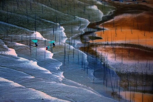 上午:北兜拍攝日出 紫菜場風(fēng)光,涵江風(fēng)光,這時候紫菜養(yǎng)殖場,拉竹竿掛苗繩,海面船只穿梭,漁民勞作一派繁忙的景象,滿灘滿海都是竿影人影船影,畫面任你裁減,紫菜還會吸收不同光源;