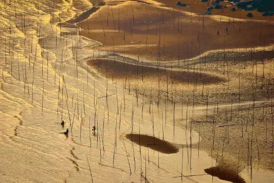 下午:南灣灘涂甲骨文圍網(wǎng)迷宮夕陽下、晨陽中,仿佛海面鍍上了一層金黃,有小舟泛過。
