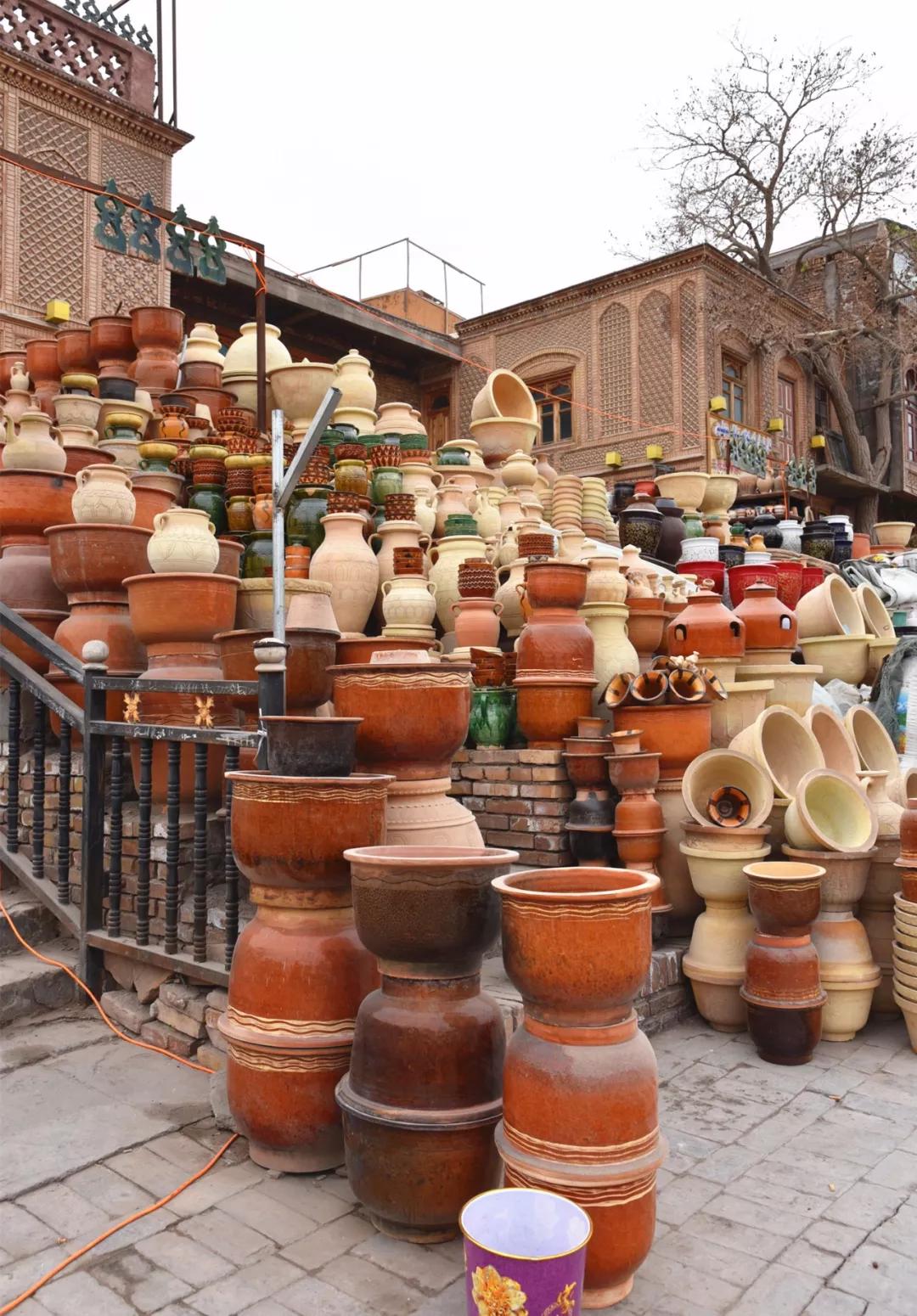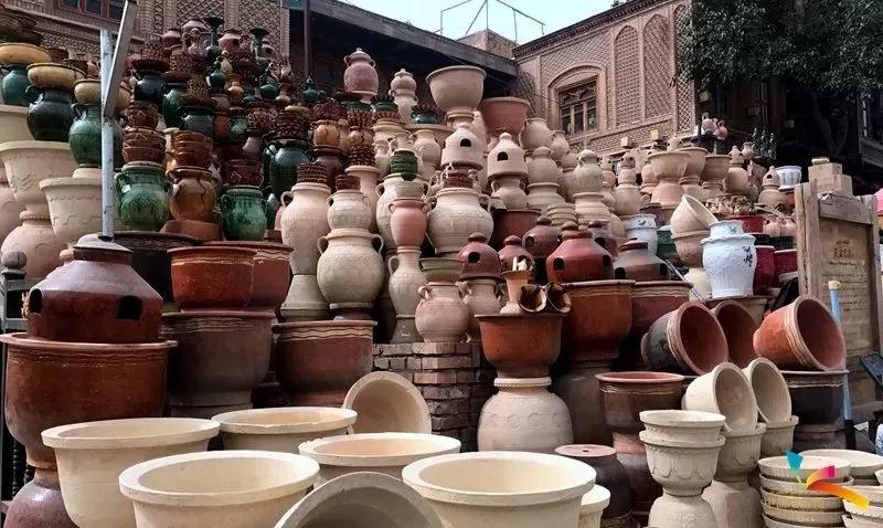 2、花盆巴扎喀什古城城門南側(cè),是花盆巴扎,巴扎入口處是彩陶墻,琳瑯滿目的陶器,讓人贊嘆不已。喀什土陶也被稱為“泥巴藝術”,器型主要以碗、碟、盤、壺等生活器具為主。(“巴扎”是維吾爾語,翻譯過來是集市的意思。)