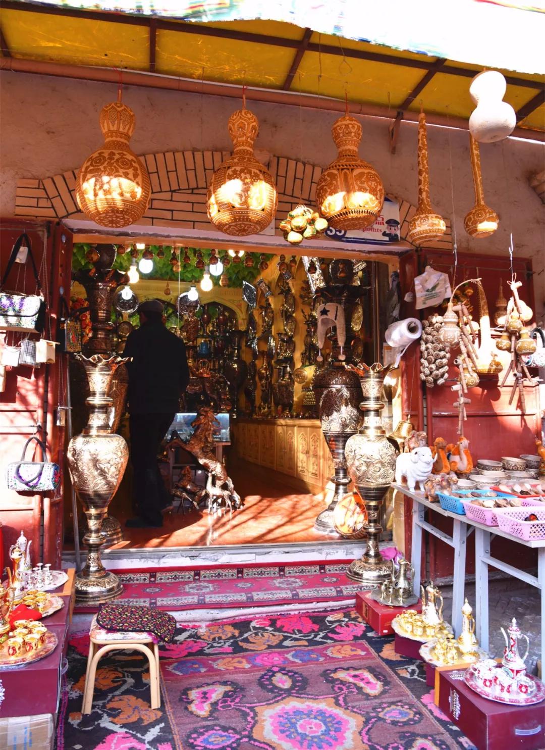 沿街開有各種店鋪。鞋帽、玉器、五金、工藝品都有,富有韻味,感興趣的可以駐足選購。祖祖輩輩生活在這里的居民,也在老城改造后加快了脫貧致富的步伐。在古城城門附近,有一個迷人的“花盆巴扎”。巴扎是老城的靈魂,幾乎每一條街道都有自己的巴扎主題。譬如坎土曼巴扎(鐵匠街)、朵帕巴扎(花帽街)、菜巴扎、油巴扎、肉巴扎、手工藝品巴扎、陶器巴扎等,各有特色。