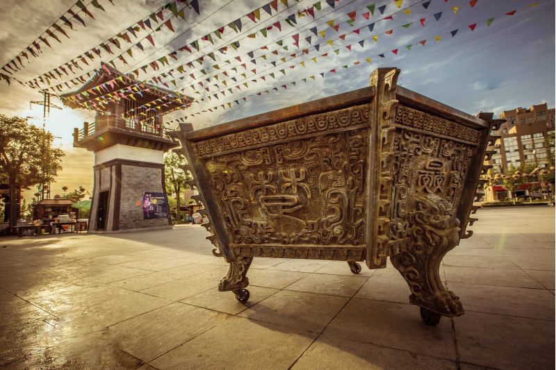 【九鼎廣場(chǎng)】是展示鼎文化的場(chǎng)所,廣場(chǎng)上每天舉行祭鼎活動(dòng)和游客參與的歌舞活動(dòng)。廣場(chǎng)上建有春秋樂宮,展示春秋時(shí)期的樂器,打造春秋音樂會(huì)。
