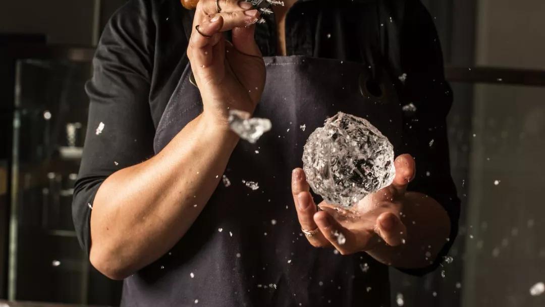 領(lǐng)悟到冰所攜帶的力量后,日本調(diào)酒師們很早便開始專研冰的藝術(shù)。所謂強將手下無弱“冰”,日本調(diào)酒師的手鑿冰球(Hand-carved ice balls)便是調(diào)酒界中的公認精“冰”。他們會使用一些特殊器具,比如冰刀、冰鋸,來操練手中的冰塊。通常,他們先把一大塊巨冰切成小份,然后手拿“冰叉”鑿啊鑿,直到把冰塊鑿成球狀。聽起來很容易是嗎?但其實,無任何保暖措施的手會被凍到毫無知覺,一個小小的失誤便會招來一趟醫(yī)院旅行。
