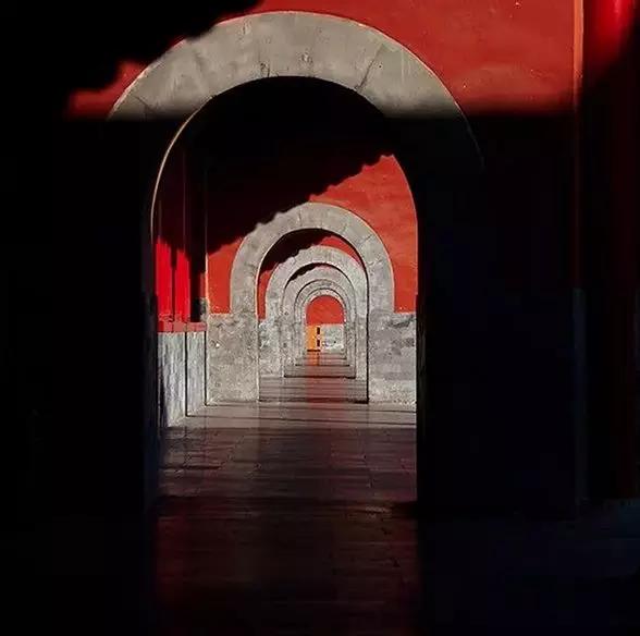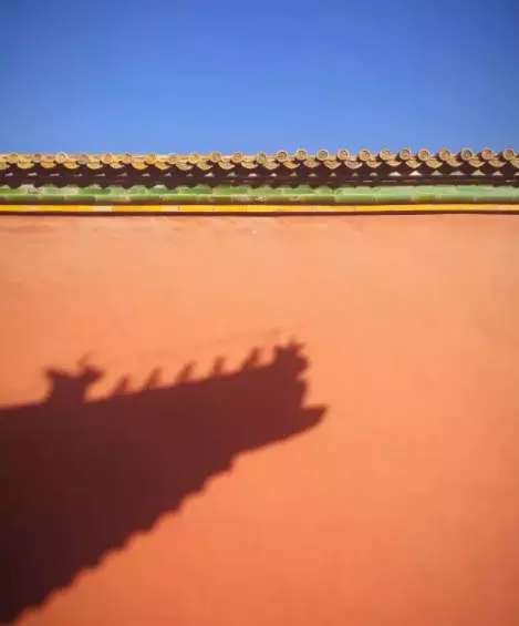 藍(lán)色的天空,紅色的宮墻,屋檐的影子打在宮墻上,加強(qiáng)了色彩的對(duì)比,讓畫面更加簡(jiǎn)潔。