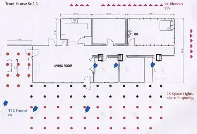 Deakins: 我的圖只是粗略的設(shè)計(jì),只是用來(lái)和我的燈光師溝通,看哪里需要什么燈。T12和天空燈是事先安裝好的,但這些燈不是用來(lái)照演員臉的,T12沒(méi)法照那么遠(yuǎn)。