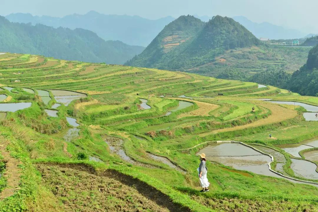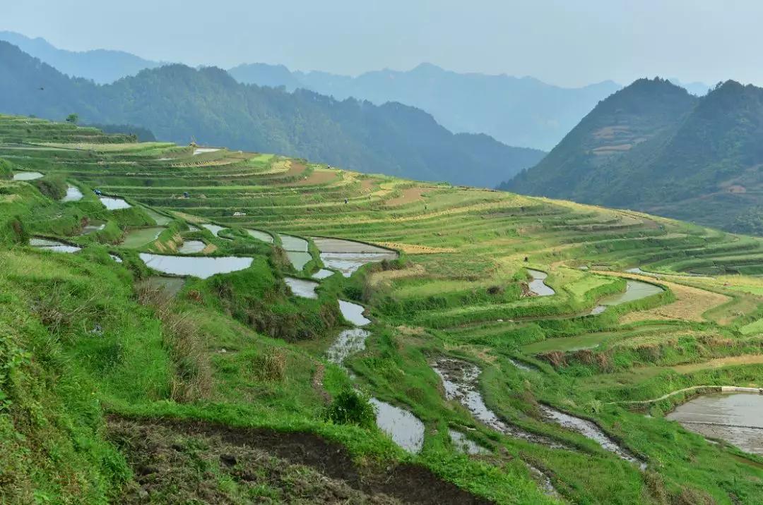 再往下走,梯田就映入眼簾了,一千多畝梯田景觀,位于一座大山之上,順著山勢(shì),層層疊疊,從山頂一直延伸至山腳。