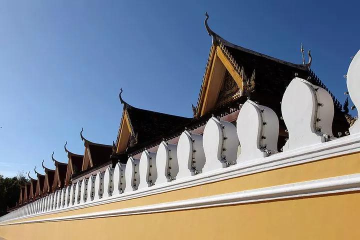 金邊皇宮是諾羅敦國(guó)王于1866-1870年建造的,充滿(mǎn)高棉傳統(tǒng)建筑風(fēng)格和宗教色彩。皇宮由一組金色屋頂、黃墻環(huán)繞的建筑組成,造型精美,金碧輝煌。
