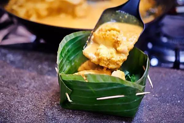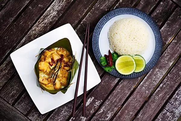 這道菜原本是古高棉人用來慶祝水節(jié)的美食,將肉類(魚、雞、豬、牛肉)裹在香蕉葉中烘烤,再加入椰汁、椰漿、高棉咖喱醬、檸檬葉和當(dāng)?shù)厥卟耍献酪院蟛粌H顏值高,椰香魚香葉香渾然一體,口感綿密有點像咖喱。