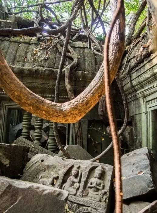 崩密列是吳哥窟公認(rèn)最神秘的寺廟,崩密列的歷史還處于不明狀態(tài),據(jù)學(xué)者推測大約建造于 11 世紀(jì)末至 12 世紀(jì)初,宮崎駿電影《天空之城》的原型,古寺搭配樹木、青苔、落葉建構(gòu)出唯美的意象。整個寺廟嚴(yán)重崩塌,石頭落了一地沒有任何保護,感覺人人都可以撿走,被叢林層層覆蓋千年,各種被封死的的門,似乎里面隱藏著大秘密。