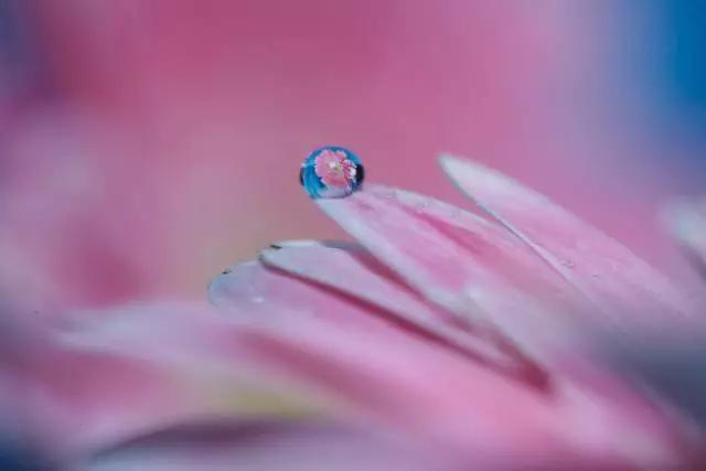 首先將花朵擺放在桌子上,然后用背景布遮擋住周圍雜亂的環(huán)境,用滴水的器材在花瓣上滴水,形成一個水滴。類似下圖中所示。