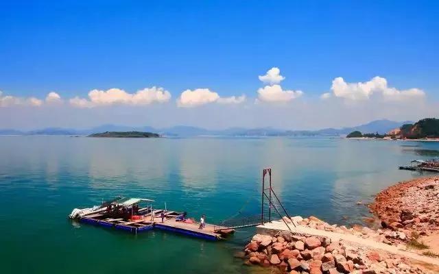 傍晚時(shí)分,林木茂密,水天一色,翠峰鵠立,湖中白帆點(diǎn)點(diǎn),波光粼粼,一片寧靜淡泊的世外桃源景象。