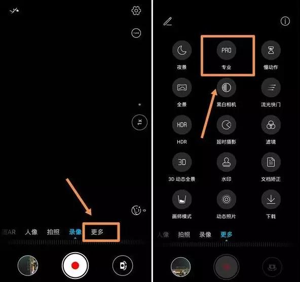 打開相機(jī)后,在主界面下面有個(gè)“更多”,我們點(diǎn)擊后界面上就會多出許多選項(xiàng),第二個(gè)就是“專業(yè)”模式(各個(gè)型號的專業(yè)模式方法開啟來不一樣,大家如果找不到,可自行搜索自己手機(jī)的打開方式)。