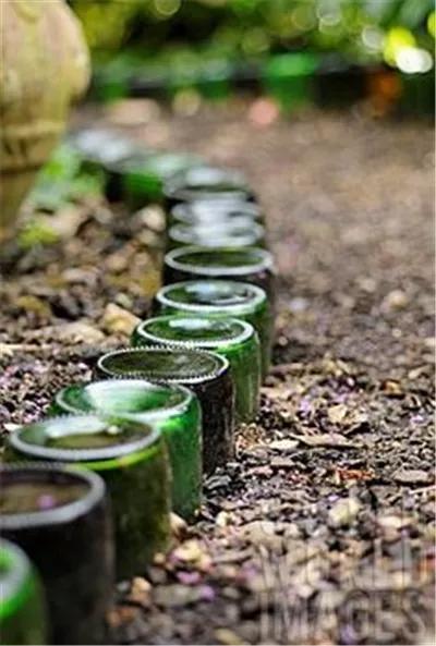 把喜歡的葡萄酒瓶埋在土里,作為花園的籬笆,露出整齊的瓶底。