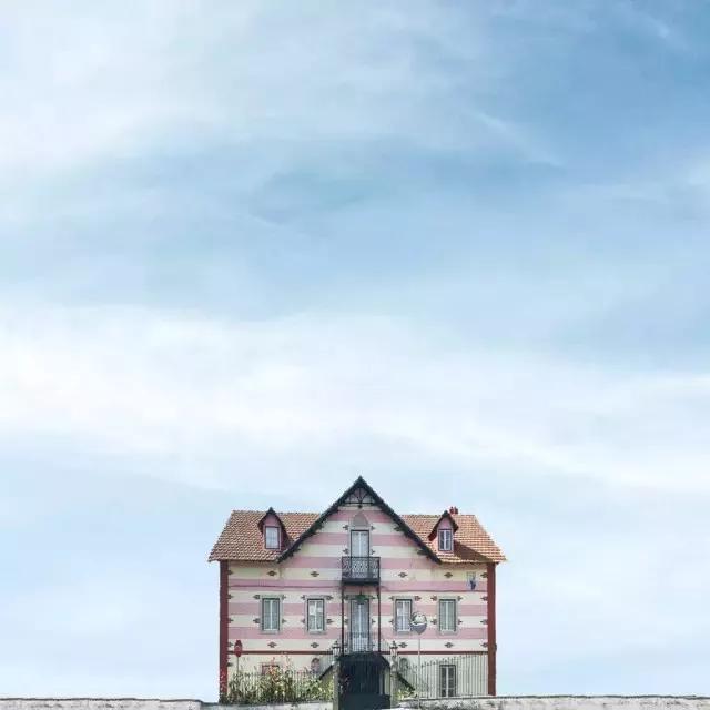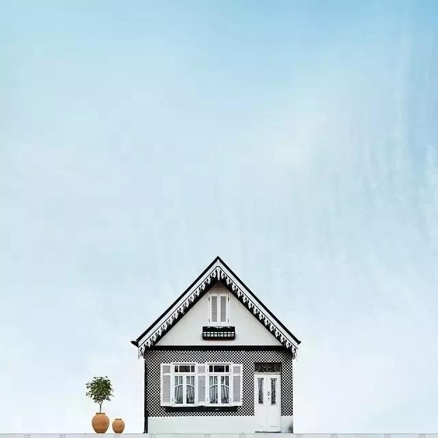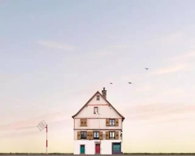 他的拍攝風(fēng)格統(tǒng)一,偏愛(ài)極簡(jiǎn)構(gòu)圖,多以藍(lán)天白云為背景,畫(huà)面的主角則是一座小房子。
