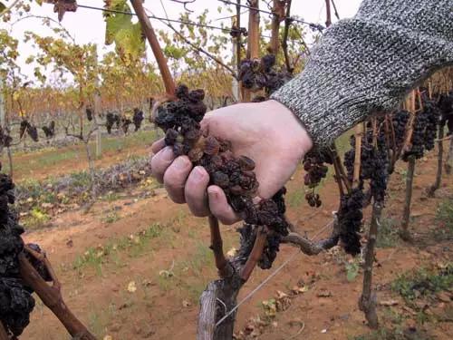 你以為這些真菌會轉化成貴腐菌嘛,too young!只有氣候極其合適的時候這些真菌才會發(fā)展成貴腐菌,大部分時候它們只配叫灰霉,能做的所有事情就是搞爛你的葡萄。趕上秋雨連綿的時候,大規(guī)模爆發(fā)的真菌侵染簡直是“車禍現(xiàn)場”。