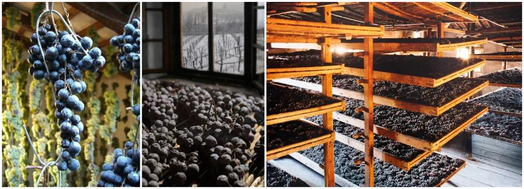 Appassimento,中文譯名枯藤法,是在采收后把成熟健康的葡萄放入風干房,采用Ploto*、 Arele*、Uva Appesa*等方式松散的放置,風干時間大致在90-120天。