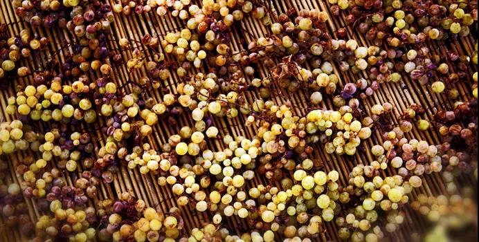 和意大利圣酒在室內慢慢脫水數(shù)月不同,這里的葡萄直接被置于陽光下晾曬12-14天,脫水后進行破碎壓榨,糖分、酸度風味物質都極為濃縮。