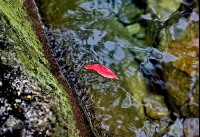 在這張照片中,紅色的樹(shù)葉落于溪流之上,打破了畫(huà)面的整體,雖然是落葉流水,但定格下的畫(huà)面令人難忘。占據(jù)支配地位倒映著青綠色苔蘚的流水中,紅色起到了平衡的作用。
