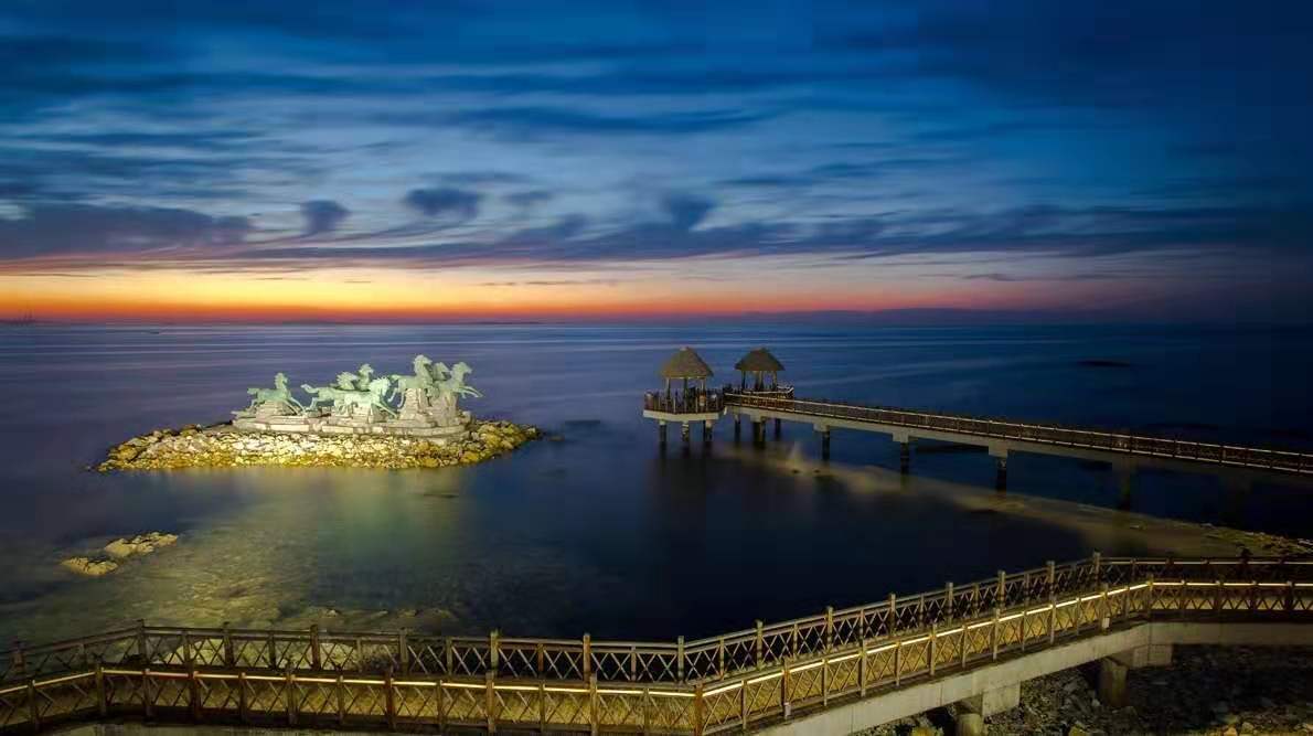 【養(yǎng)馬島】(約30分鐘):當(dāng)年秦始皇東巡養(yǎng)馬處,島上丘陵起伏草木蔥蘢,山光海色,秀麗如畫,島前海面寬闊,風(fēng)平浪靜,島后群礁嶙峋,驚濤拍岸。車游養(yǎng)馬島海灣,遠(yuǎn)觀跨海大橋、象島;