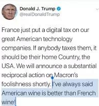 “雖然我不喝酒,但比起法國,我更愛美國葡萄酒?!碧乩势?6日在社交媒體發(fā)文對此前法國的數(shù)字服務(wù)稅做出回應(yīng)…