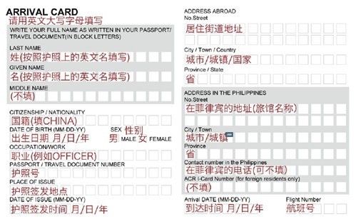 中國公民在結(jié)束菲律賓觀光旅游,于機場辦理出境登機手續(xù)前,應(yīng)先交納機場稅,然后到訂購返機票的航空公司柜臺前辦理出境登機手續(xù),領(lǐng)取登機卡和行李卡,同時向航空公司工作人員遞交出境卡。出境卡的填寫內(nèi)容同入境卡基本相同。