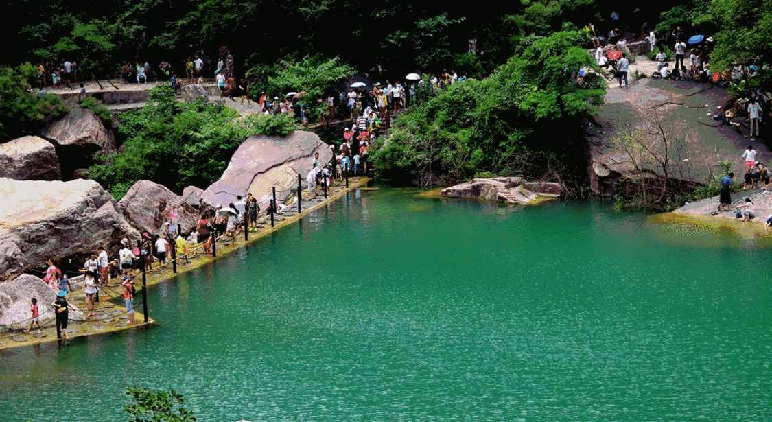 主要景觀有:猿人峰、守望臺、奇石走廊、清水華蓋、紅石廣場、翡翠潭、青苔瀑、見龍瀑、飛龍瀑、躍龍瀑、雙龍瀑、五連瀑等豫北最大的瀑布群,景點多達(dá)100多處,一步一景,一景一奇;其中見龍瀑落差達(dá)320米,瀑布最大流量可達(dá)3000立方米/秒,似云龍飛瀑,氣貫如虹,號稱“中原第一瀑”,翡翠潭碧綠無暇,明麗如畫,潭水蕩漾,猶如人間仙境,被譽(yù)為“太行第一潭”
